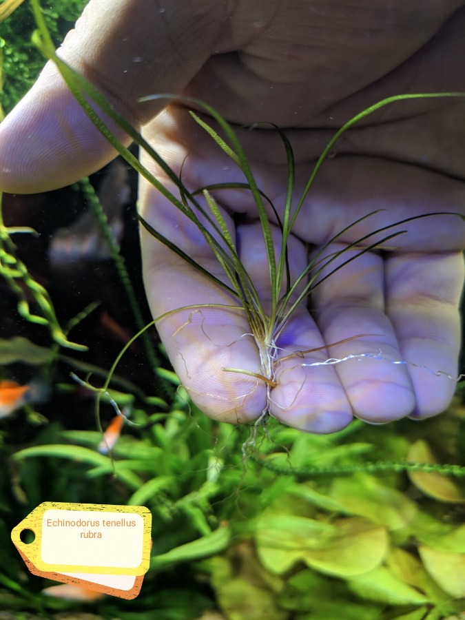 Эхинодорус рубра – кустовое аквариумное растение. В аквариуме вырастает обычно не выше чем на 10 см. Ширина листа 3-5мм и менее. Эхинодорус в плохих условиях мельчает и редко вырастает выше 5см. Тем не менее, может расти даже без добавления удобрений и СО2. Не требует большой интенсивности освещения в аквариуме. Цвет листа эхинодоруса рубра зависит от интенсивности освещения. Оттенки листа могут варьироваться от золотистого до красного и даже фиолетового. Так же существует зависимость окраски эхинодоруса от рН аквариумной воды. При равных условиях в аквариуме, в кислой воде (рН менее 7) эхинодорус может приобретать более зеленый оттенок. В то время как основная среда (рН более 7) в аквариуме может действовать на эхинодорус как интенсивное освещение. Поэтому часто можно наблюдать красные листья эхинодоруса рубра в аквариумах без подачи СО2 и без интенсивного освещения. Благодаря своим миниатюрным размерам, пожалуй, это единственный пригодный для акваскейпинга вид эхинодоруса. Он легко образует ковер на переднем плане (лучше ближе к среднему плану) аквариума, благодаря активному росту его боковых побегов. Боковые побеги очень длинные, поэтому следует время от времени их отстригать во избежание его распространения по всему аквариуму. Собственно, в этом и заключается вся процедура его стрижки и удержания в области плотного ковра. Так же нужно иногда прорывать ковер эхинодоруса нежного. Иначе, он может наслоиться и стать слишком высоким.