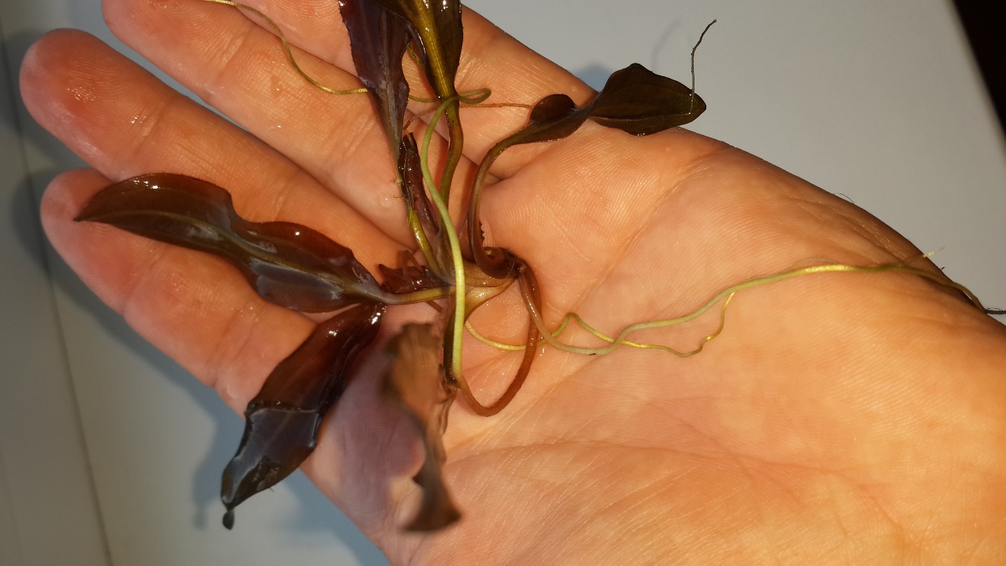 Echinodorus ‘Дорогой Леонид Ильич’ действительно заслуживает внимания. Среди других он выделяется жесткими, глянцевыми листьями с очень глубокой окраской. Молодой лист — ярко красный, затем темнеет, становится коричневым, и эта коричневая окраска держится очень долго, даже на очень старых листьях. Детка см 10.
