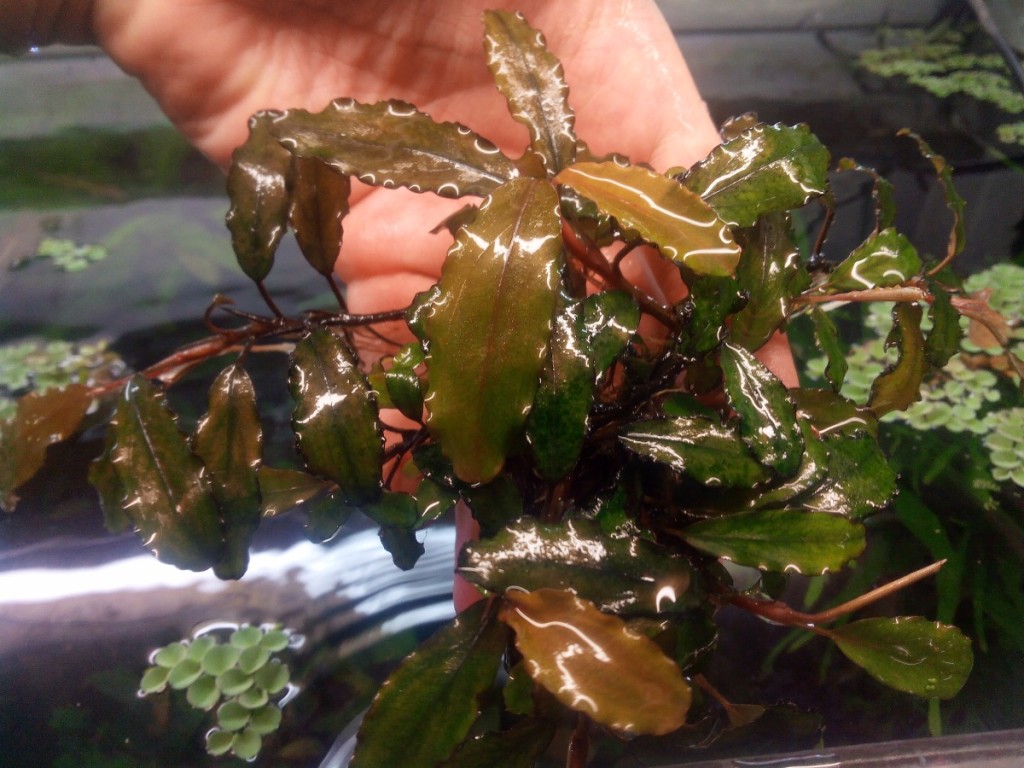 Bucephalandra sp. Claudia — средних размеров. Молодой лист золотистого оттенка, на краях волнистый.