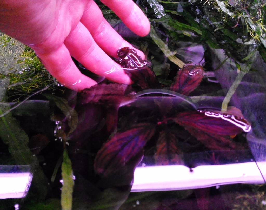 Одна из моих любимиц. Обладает неповторимым цветом, который соответсвует названию — молодой лист с красным оттенком. Четкая центральная жилка. Фото не передает всей красоты. Эта буцефаландра будет настоящим украшением аквариума.