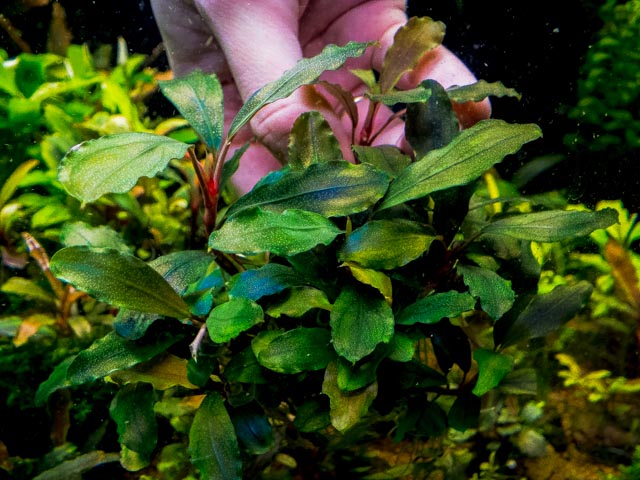 Одного из отростков Bucephalandra sp. Batang kawa не менее 5 листиков с колонии на фото.
