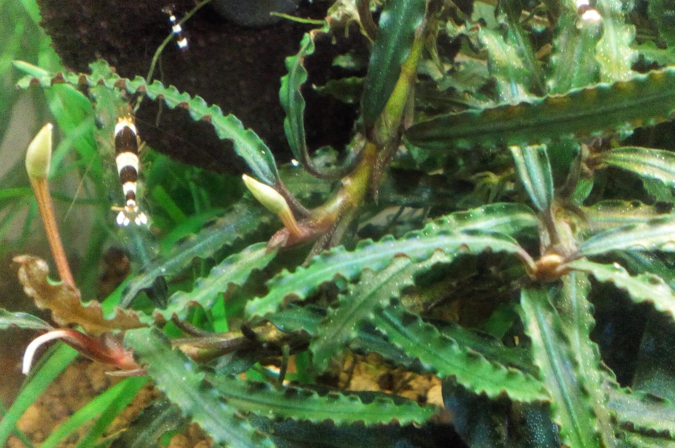 Bucephalandra sp. Kayu lapis 1 — всегда будет выделяться из группы растений благодаря форме своих листьев. Хорошо кустится, достаточно быстро разростается образуя пышные заросли, которые очень эффектно смотрятся. Очень интенсивно цветет. Цветок белого цвета.