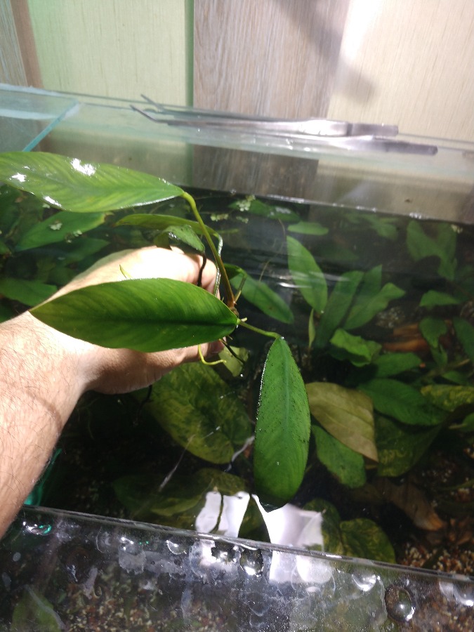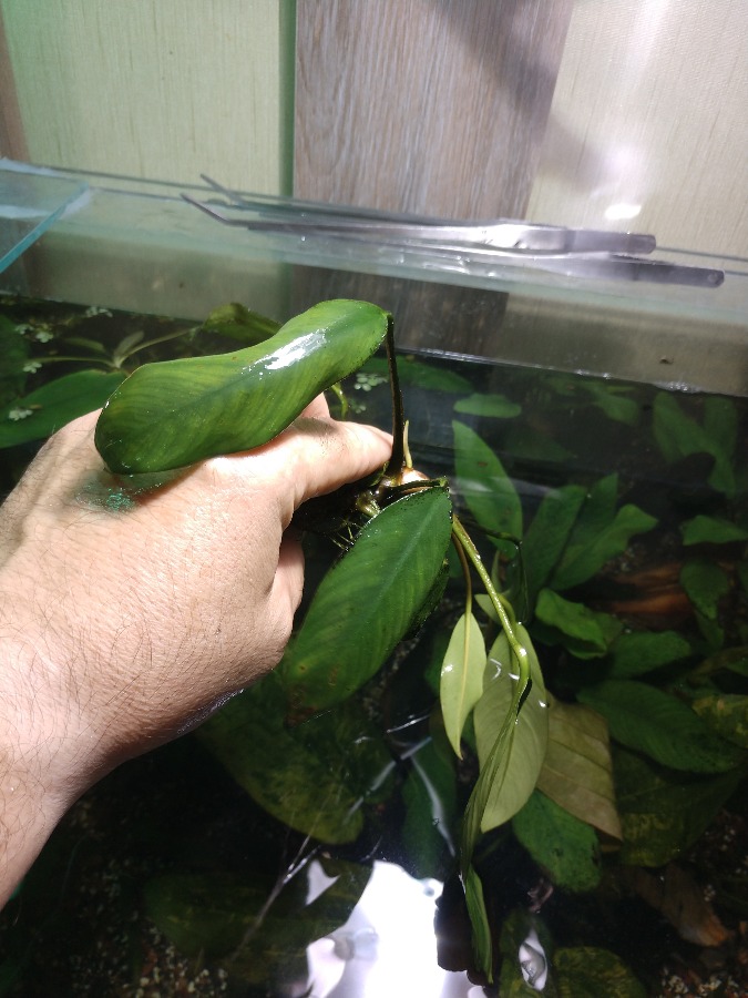 Предлагается известный анубиас афцели. Вырос в аквариуме, есть небольшие обрастания как у растений этого вида росших не в тепличных условиях.