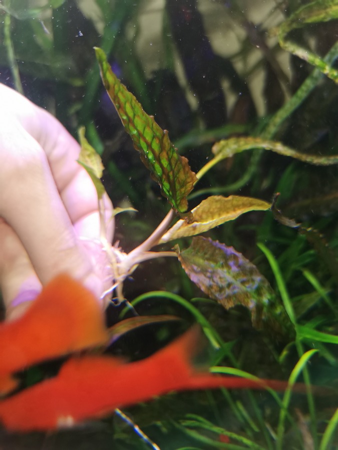 Её отличия от обычной зеленой родственной — прожилки, красный крап по листу, и штрихи перпедикулярные к прожилкам, первый лист ближе к жёлтом, взрослый темно зелёный, а название (Green Pink Rosanervig) под которым её покупал, явно не от ботаников, а от маркетологов;) поэтому пишу её sp.