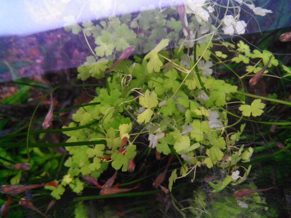 Вашему вниманию предлагается интересное почвопокровное растение: Hydrocotyle tripartita — большой пучок. часто классифицируется как почвопокровное растение. Однако, покрывает грунт она очень специфическим образом. Не стоит ожидать от этой гидрокотилы, что она будет пускать побеги в грунт и тем самым расползаться по нему, как это свойственно почвопокровным аквариумным растениям. Нет, это аквариумное растение лучше классифицировать как витающие в толще воды и это является ее отличительной особенностью. В этом ее ценность для акваскейпинга. Гидрокотила трипартита почти не укореняется и грунт ей вовсе не нужен для того, чтобы создать своеобразную зеленую группу. Ее побеги переплетаются внутри группы, тем самым, уплотняя ее. Укореняются лишь те побеги, которые оказались близко к грунту. Зеленый коврик в классическом понимании гидрокотила трипартита не образует, поэтому располагать ее на переднем плане не стоит. Это растение исключительно среднего плана. В среднем плане акваскейпа как правило создаются локальные точки и гидрокотила как раз для этой цели является замечательным выбором. Бонусом будет интересное плавающее растение Salvinia cucullata!