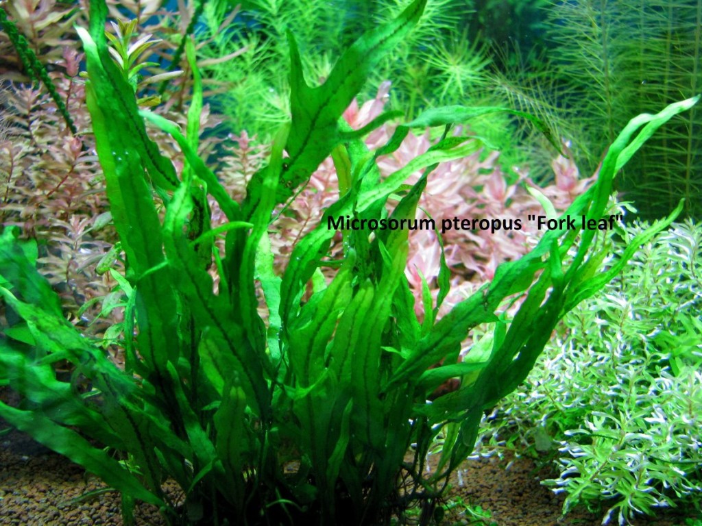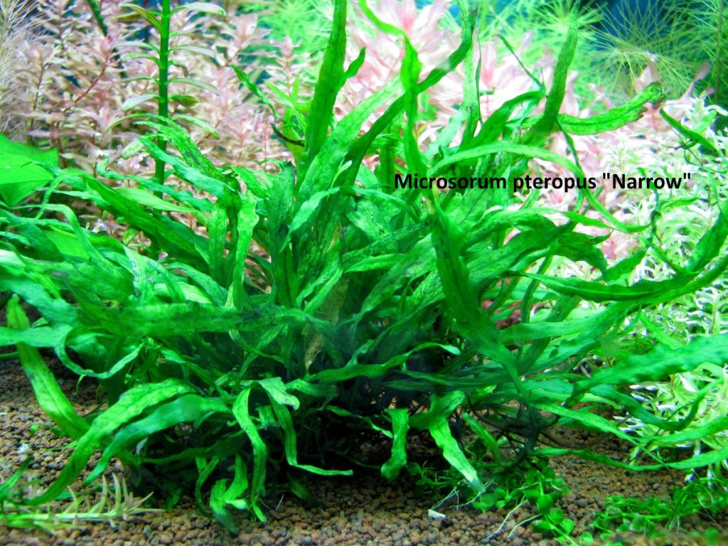 — Microsorum pteropus «Narrow K», куст на фото посередине