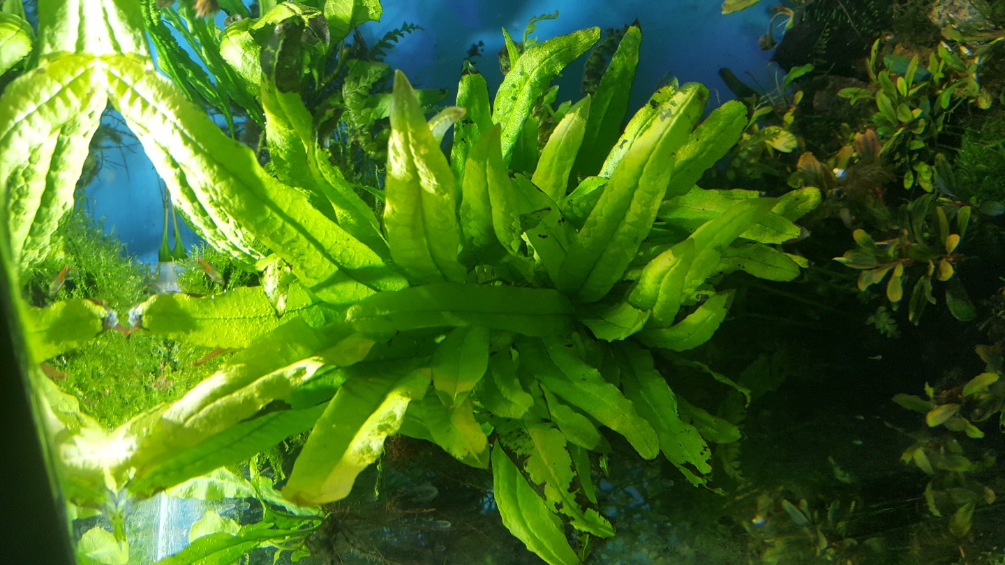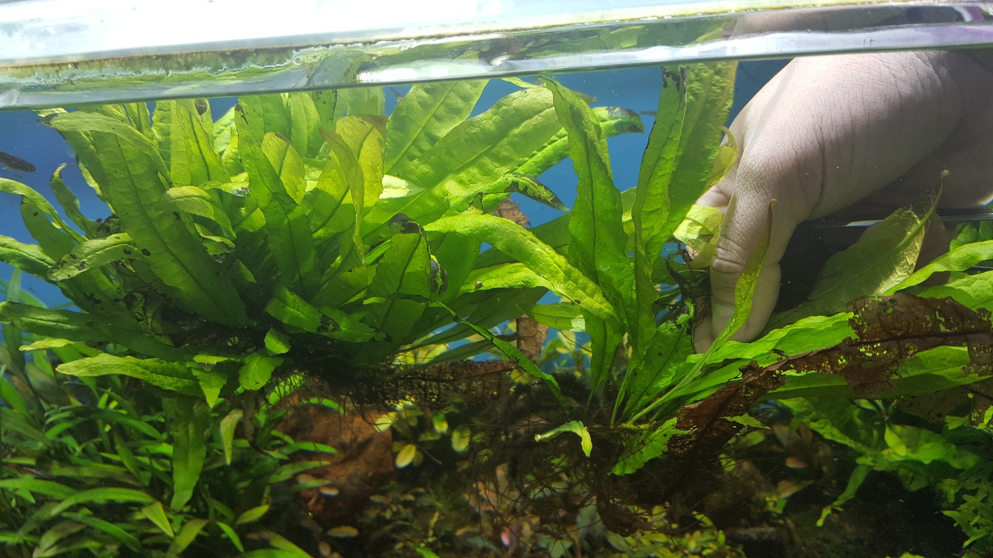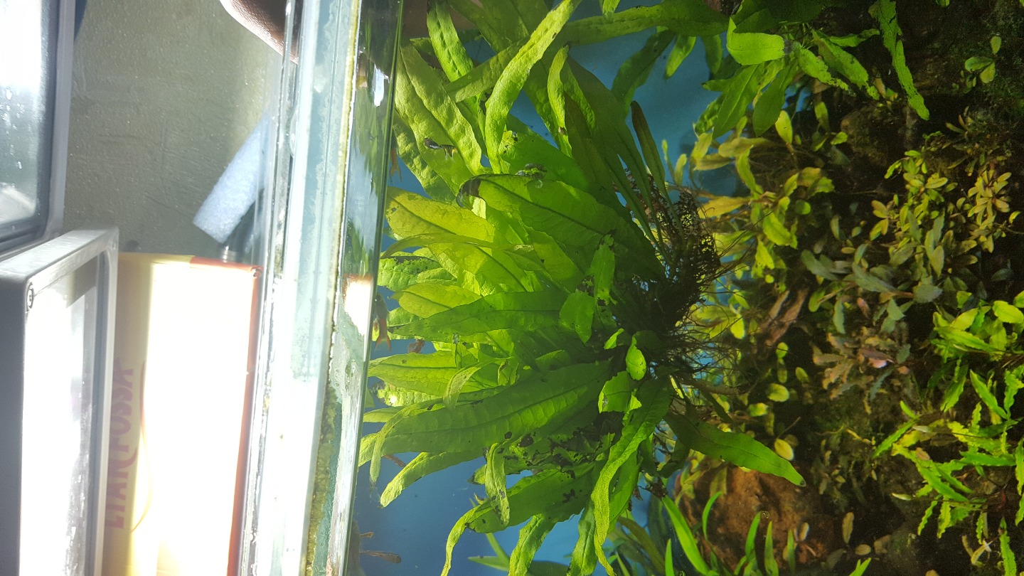 Предлагаю молодую поросль папоротника : таиландский красный (Microsorum Pteropus «Red»), однако у него часто появляются листья рассечёные на 3 части, на фото видно, потому название может не вполне соответствовать. Кустики до 15-17 см, достаточно много, на фото , пучком. Растут в жёсткой воде с немного удо и со2. При хороших условиях могут вырасти большими, листья ближе к верхушке становятся кирпичного цвета.