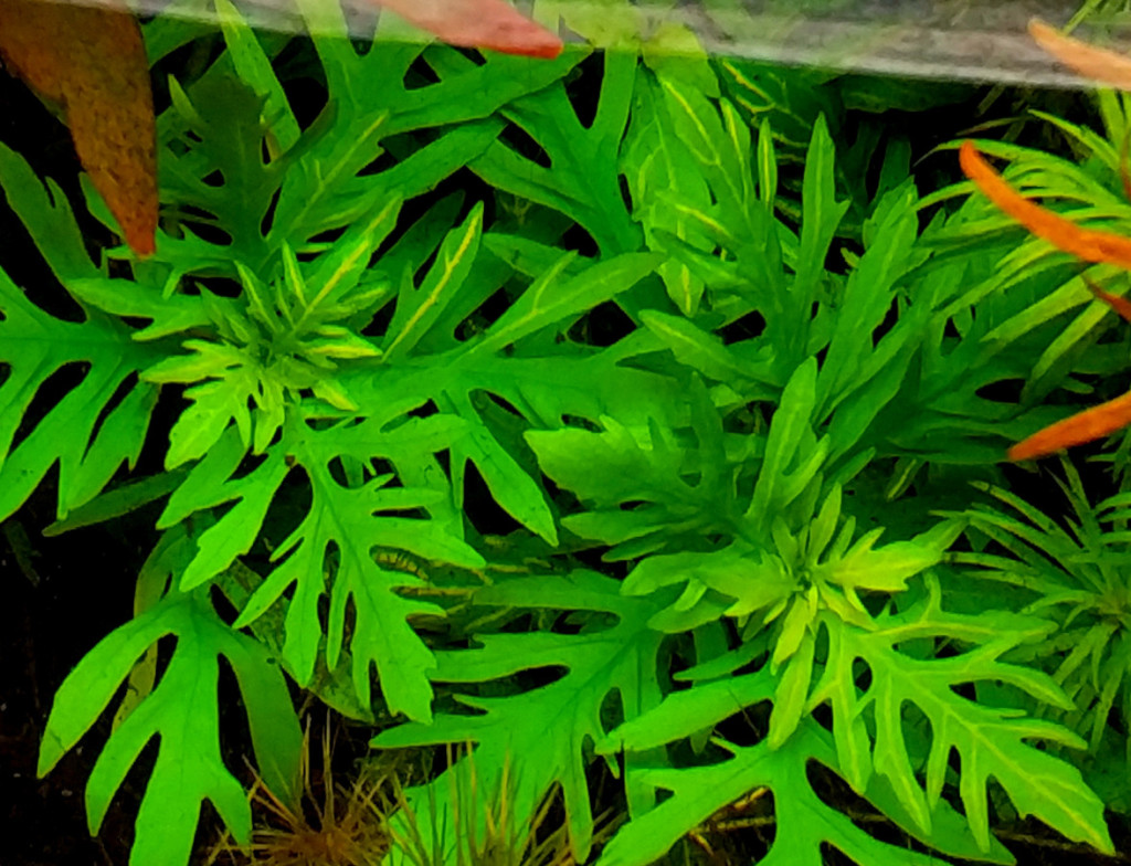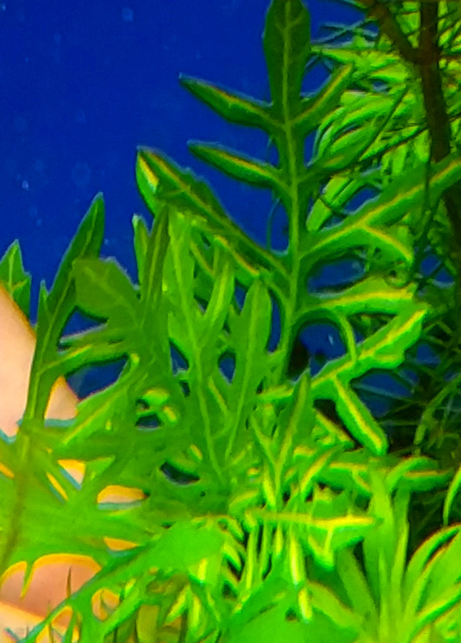 Фото с телефона, сори. Первое фото у дальней стенки. Второе сверху, молодые ветки под листьями которых проглядывают относительно старые листья с более ярким рисунком. На фото из аквариума со светом 0,65 Вт/л практически у дна 50 сантиметрового аквариума. При более мощном свете и питании вид потрясающий!