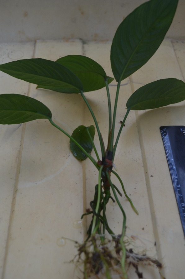 Куст Anubias heterophylla. Приобретен в 2015 году. Первоисточник — голландская компания «Songrow». Анубиас предпочитающий полупогруженную форму произростания. Содержался без удобрений. Свет — 2 лампы ЛБ-30, еженедельная подмена воды.