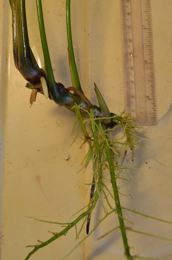 Anubias heterophylla. Приобретен в 2015 году. Первоисточник- голландская компания «Songrow» . Анубиас предпочитающий полупогруженную форму произростания. Содержался в паллюдариуме. Свет — 2 лампы  ЛБ-30, еженедельная подмена воды.
