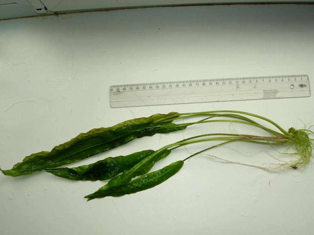 Длина 40-50 см. Высокорослая крипта с ланцетными гофрированными листьями (в бордово-красных разводах с обратной стороны листа)