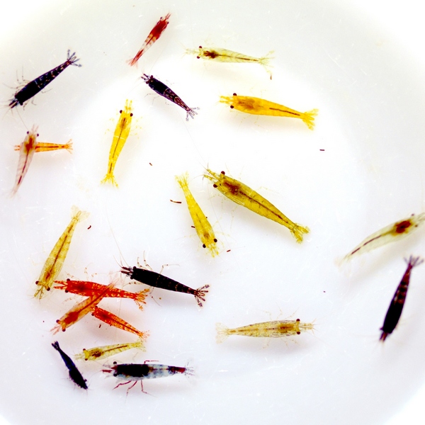Лот: мікс відбраковки кольорових креветок неокаридин 15 штук . Молодь. Розмір — 1,5-2 см.