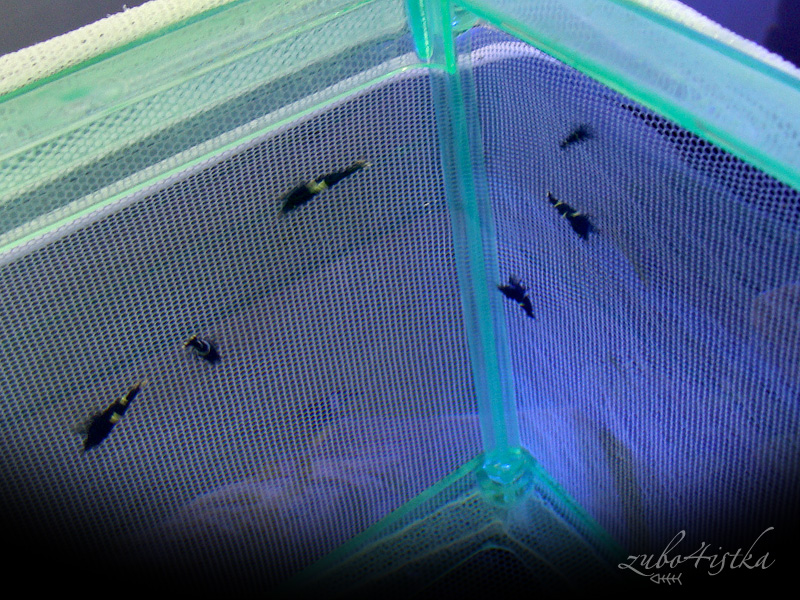 Лот: креветка Taiwan Bee с окрасом между Пандами и Конгами, 5 шт. На фото видно, какие они (это и есть лот, уже наловлены и сидят в отсаднике).