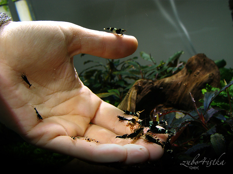 Все панды Шэдоу, т.е. с геном голубизны, прости меня господи )))) Если и смотрятся белыми — поголубеют с возрастом, проверено. Предупреждаю об том заранее, некоторым такие не нравятся. Опять же: белый цвет у креветки сразу после линьки, потом она голубеет до следующего сброса шкурки.