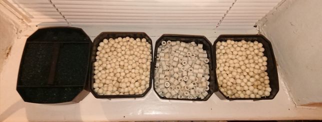 4 лотка с наполнителями ( мочалки разной пористости,Био-КОЛЬЦА, JBL шарики, синтепон )