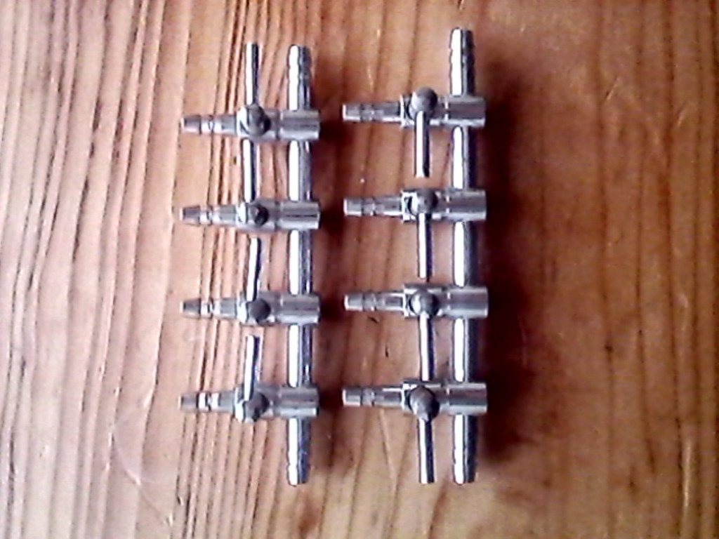Предлагаю распределитель СО2 или воздуха, 2 шт на 4 выхода, есть краники для регулировки подачи воздуха.