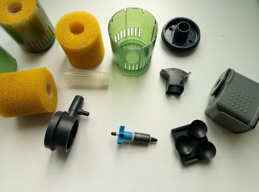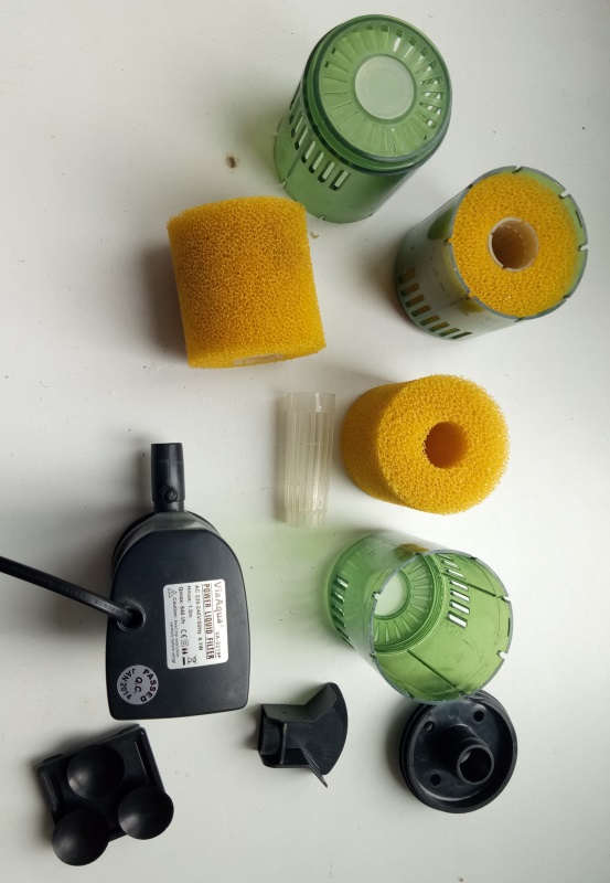 Фильтрующие губки помещены в 3 пластиковых стакана. При желании туда можно положить синтепон для более тонкой очистки, либо уголь.