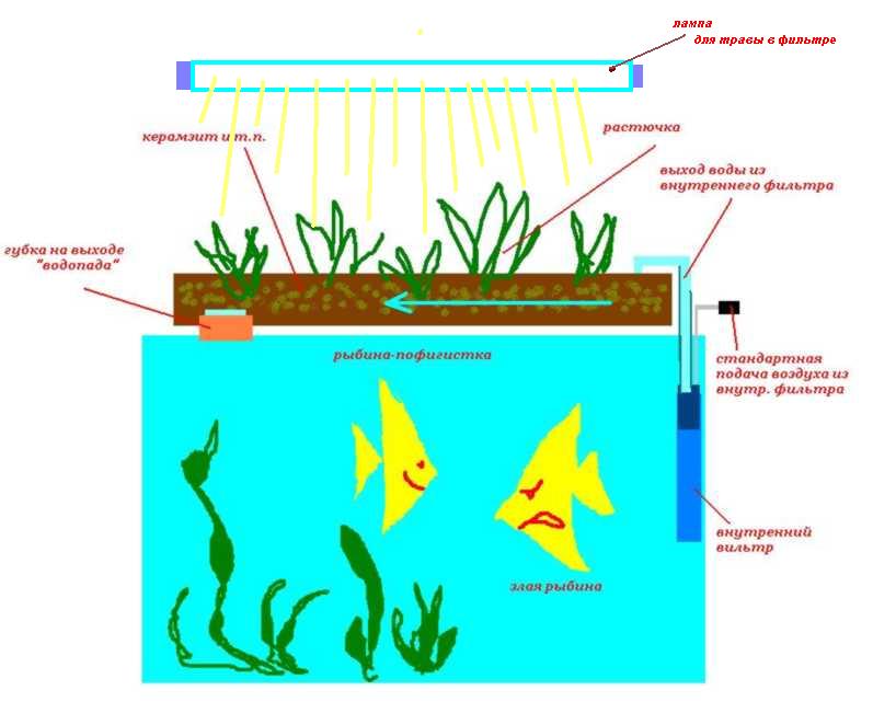 Я уже неоднократно писал о системе фильтрации, которую применяю. Это принцип открытого внешнего фильтра, который размещён НАД аквариумом и, может быть стилизован, в той или иной степени, под водопад. (см. схему и фото)