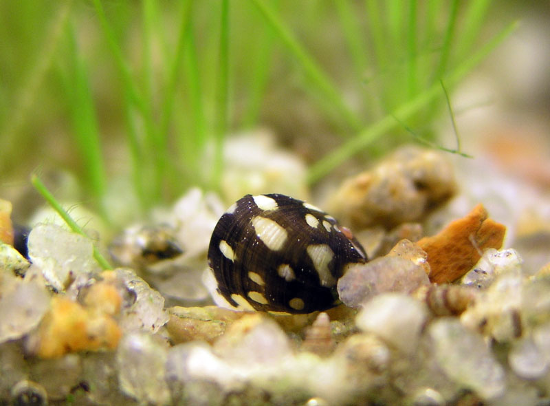 Это представитель семейства Neritidae из рода Theodoxus - скорее всего Theodoxus fluviatilis. У меня твои долго не отлаживали икру, а теперь начали активно отлаживать. |