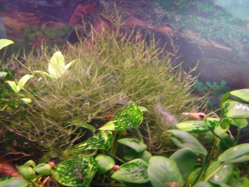 Вот только листики у мха немного «прожглись», но мох живой. В банке был малёк гупарей, креветки, улитки, анциструсы, растючка – ВСЁ ЖИВОЕ. Даже "зеленая гадость" на анубиасе пропадает на глазах.