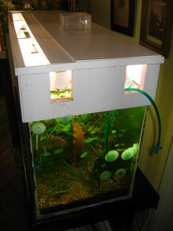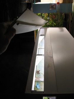 Теперь о светильнике реанимационного аквариума. Материал - PVC 4 мм.На фотографиях, надеюсь виден принцип конструкции. Вентилятор обдува, решетка, и выходные отверстия для теплого воздуха. Лампы(СИЛЬВАНИЯ) работают на украинских ЭПРА уже год. Есть фото клея для PVC и вид на светильник(сверху) большой банки. Ранее он планировался как закрытый, но МГ сделал свое дело.Там на тех же ЭПРА стоят две лампы по 55 вт ОСРАМ ФЛОРА 77.