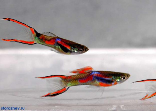 Взрослые самцы (не отдаются) собственного уже разведения очень ярко окрашены, с красивыми длинными плавниками. Сфотографировать не получается, потому ссылка из нета - больно быстрые ребята )) Рыбка неприхотливая, любопытная, шустрая и весьма забавная. У нас живут в 27 по Цельсию, один малек выжил, будучи случайно перенесенным с риччией в большую акву с дискусами в 30.