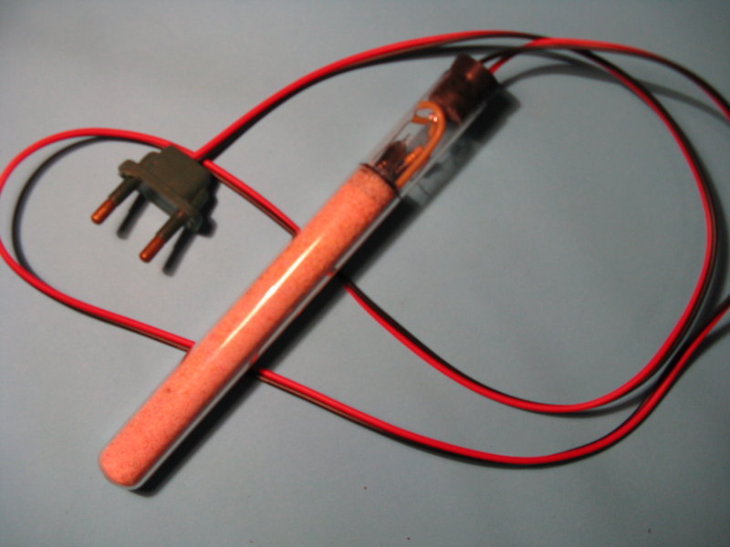 Рассчитываем на сколько ватт будет наш обогреватель, припаиваем резисторы друг к другу, тем же способом присоединяем к ним проводники и надеваем на один проводник отрезок полихлорвиниловой трубки, затем помещаем их в пробирку и засыпаем мелким сухим песком. Закрываем тонкой пробкой следя, затем чтобы проводники располагались на разных сторонах пробки, и не очень плотно, чтобы песок дышал. Надеваем на один проводник трубочку, припаиваем и индикатор. Толстую пробку покалываем иглой от мед. капельницы у края, подеваем в иглу одну жилку электропровода и вытягиваем иглу, тоже проделываем с другой жилой только проколов пробку на другом краю. Припаиваем все у пробки обогревателя и осторожно, немного поворачивая, закрываем. Прикрепляем электровилку, проверяем правильность соединений тестером, если все в порядке – включаем в сеть. И все.