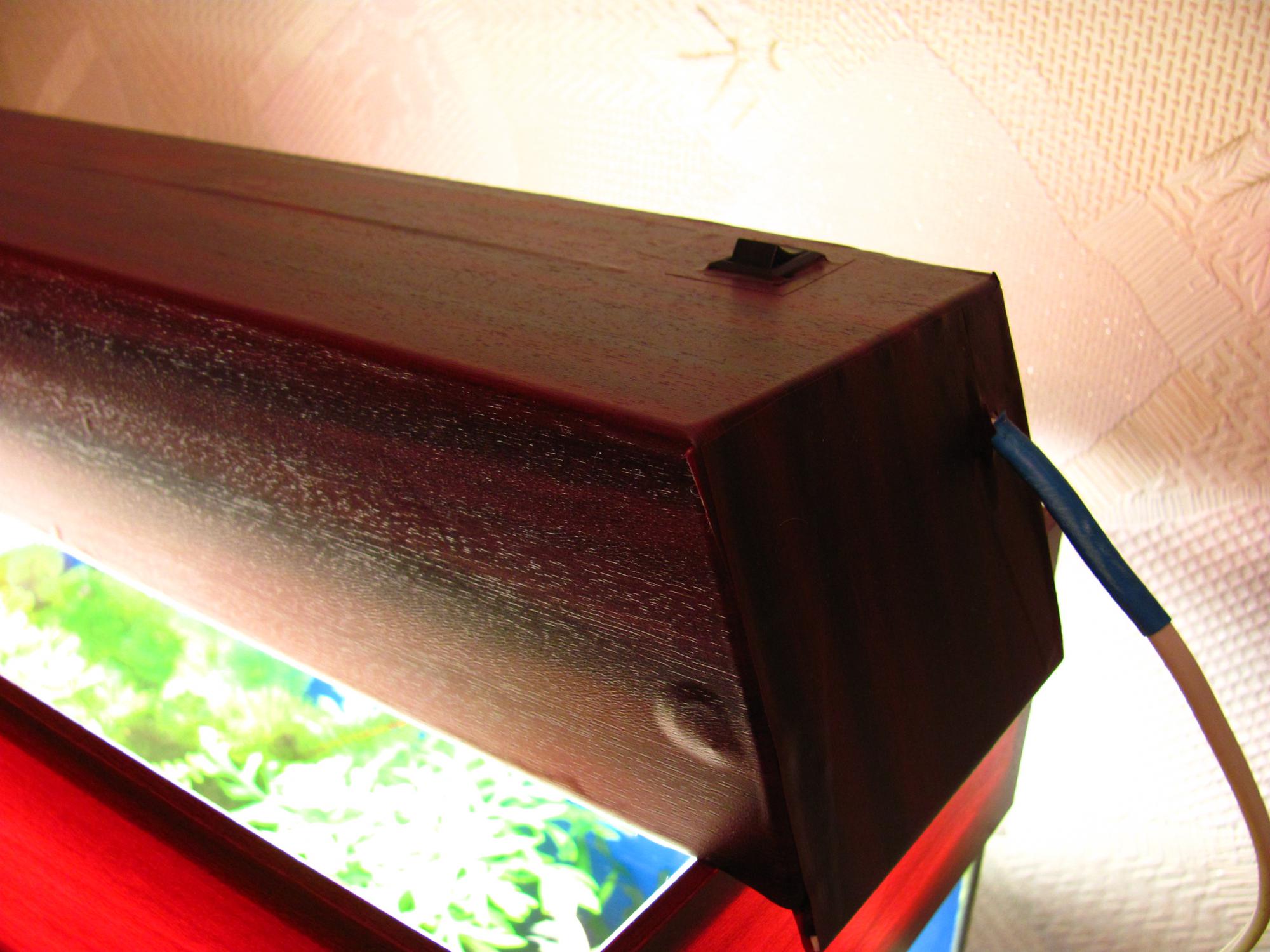 Итак, продолжим. Из оставшейся от большого короба крышки вырезал 4-ре перегородки. Две внутренних стоят строго перпендикулярно, две внешних под острым углом. Края перегородочек немного выходят за саму балку, вклеены они так, что бы между ними с обеих сторон как раз оказалось стекло аквариума. Это позволило немного упростить себе задачу, дела я балку не строго на банку 440 мм длинной (что таки чревато ошибками, т.к. аквариумы тоже наши люди клеят), а для баночки от 430 до 450 мм.