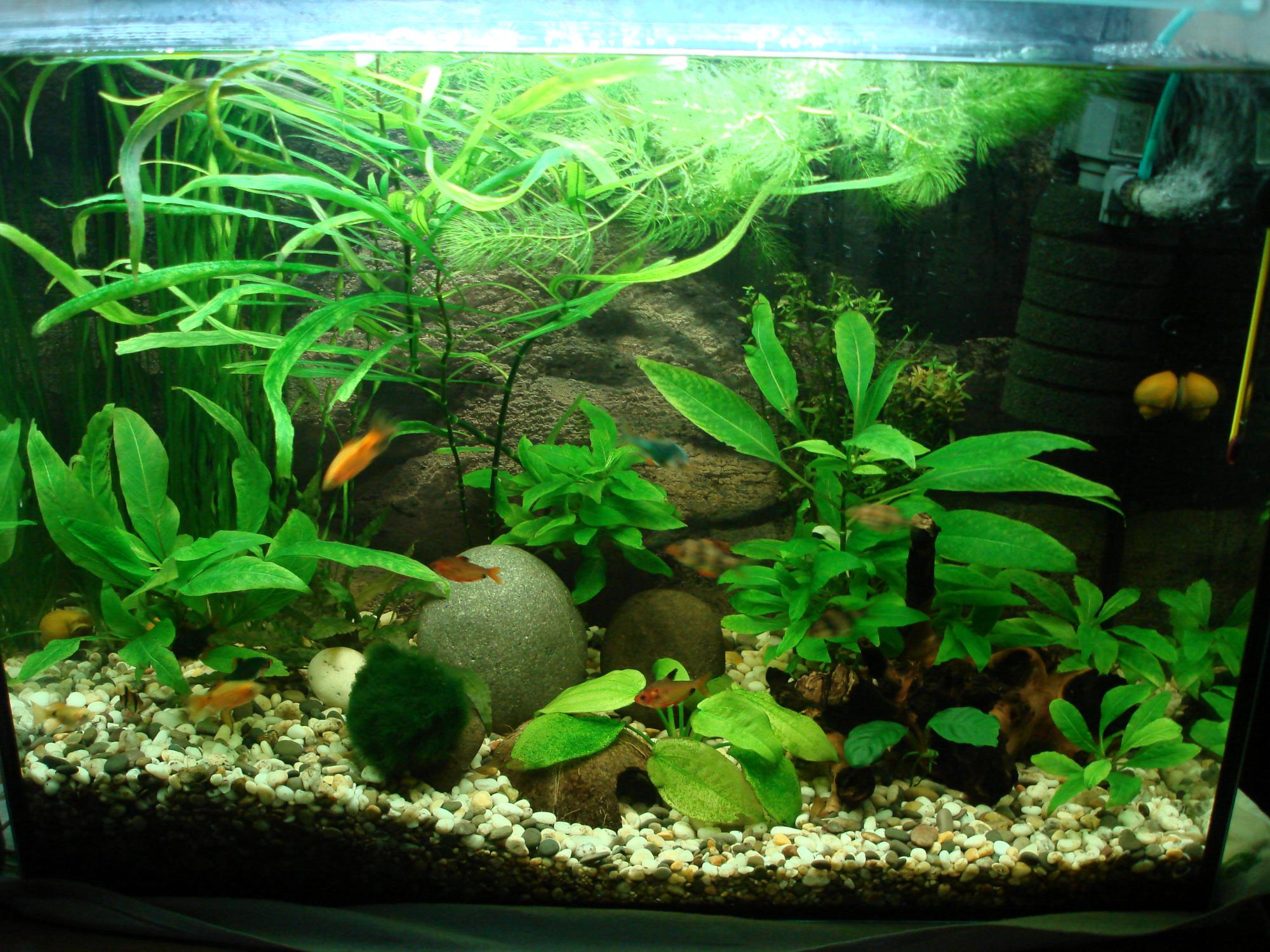 Купил коряжку , выбрал где то 2-3 кг крупных камней и заменил на 3-5мм. , наклеел фон , нашел на отдыхе в Крыму пару булыжников , не поскупился на растения и взял сразу 5-6 кустов , тогда для меня ето казалось мно и возникал вопрос куда же я ето все посажу ))) рассадил все и после недели работы купил рыбок . ( барбус суматранский 4 шт , мутант 4, огненный 3, минор 3, анцытрусов пару ) и есче две улитки ) которые почти сразу отдал , обижали их сильно .