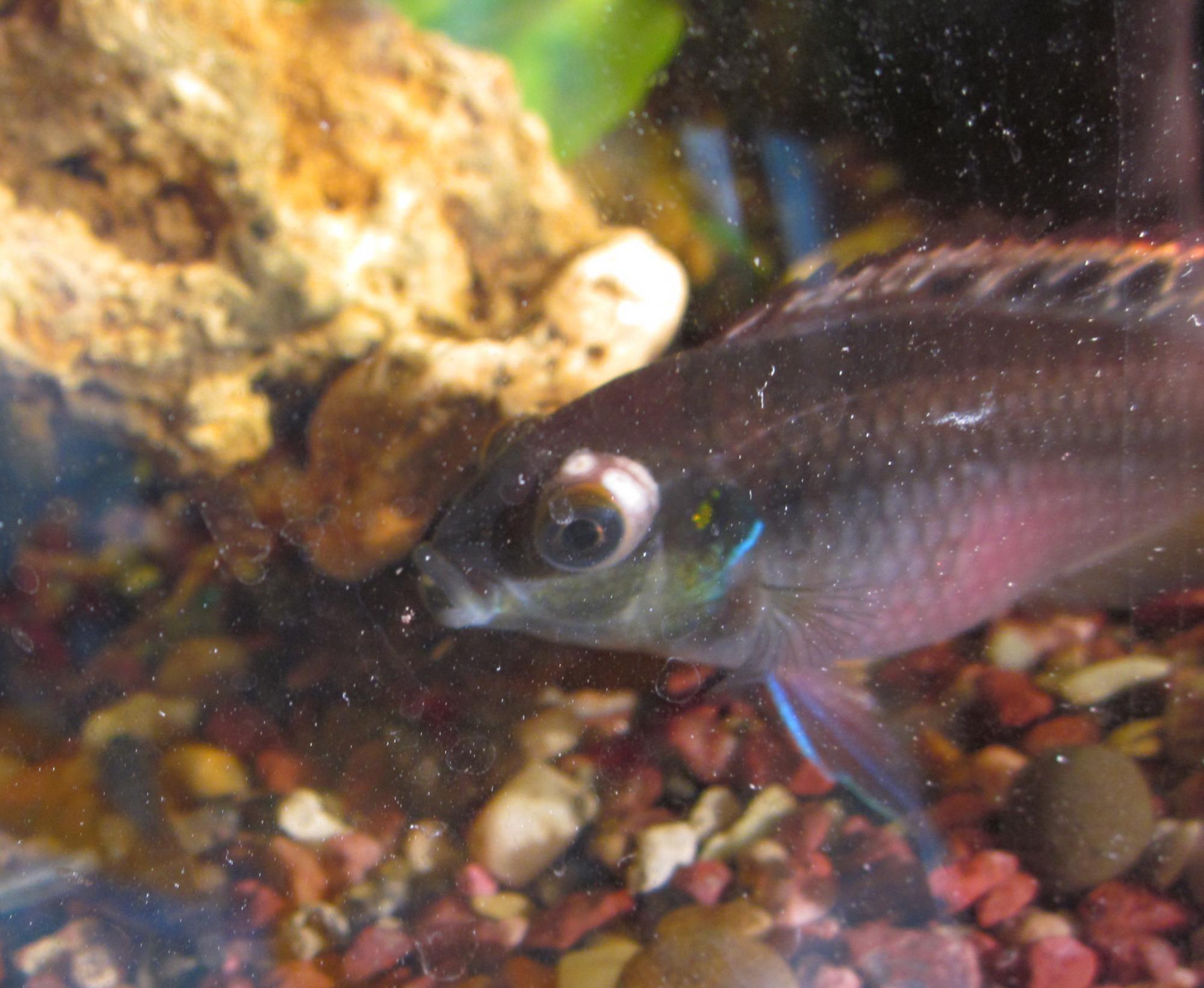 у пельвикахромиса пульхера(мальчик 2года)заметила вялость поведения,выпученые глаза,на одном глазе-белые пятна пятна,он держится ближе ко дну,в укрытиях.Пятна сегодня заметила,а вялый он стал месяц назад,когда погиб второй пельвик.В акве гуппи,данио и тернеция есть-с ними все нормально,шустрые,с наступлением лета погибли пара мечей,пельвик и пара данио,связывала это с жарой,в акве +28 и перекормом.Что у пельвика,подскажите?!
