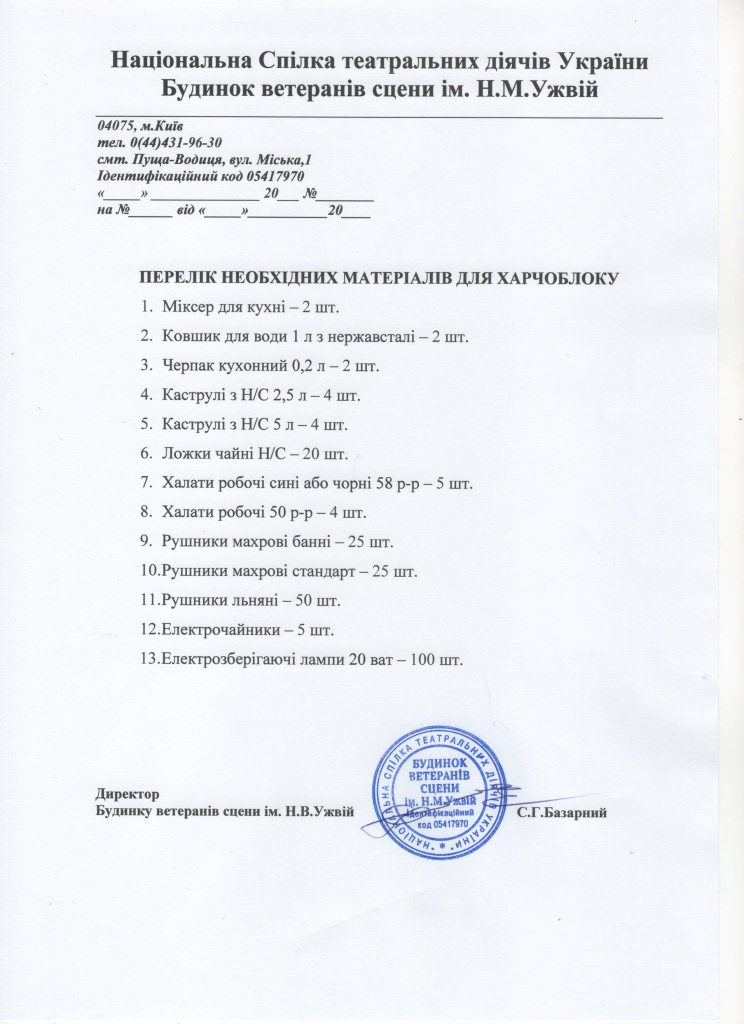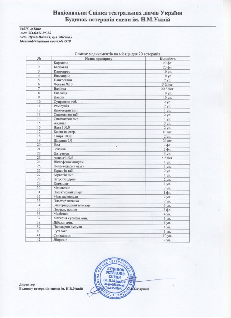 Будинок ветеранів сцени ім. Н.В.Ужвій не отримує належної допомоги від держави. Персонал будинку робить усе можливе, щоб оточити цих людей турботою та любов’ю. Але на жаль, одного бажання та ентузіазму не достатньо. У Будинку відсутні найнеобхідніші ліки, не вистачає харчів, одягу, відсутні кошти на придбання необхідного обладнання та матеріалів. Ці люди з великою радістю і вдячністю приймуть будь-яку Вашу допомогу.
