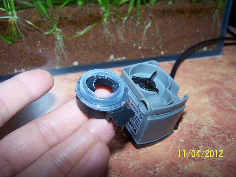 В бщем виде процесс представлен на фото. Для крепления колбы водозаборника из полиэтиленовой пробки (запчасть №4) была вырезана переходная муфта и приклеена на крышку турбинной камеры помпы. Также понадобилось срезать верхнюю часть крышки помпы, что не повлияло на целостность помпы и позволило задействовать имеющиеся на ней присоски для крепежа конструкции на стекло. Мерный колпачек от удобрений также был слегка модернизирован под нужды конструктива: срезано дно под диаметр трубки (чуть меньше 2,5 см для плотности надевания) и вырезаны 3 отверстия для забора пленки с поверхности воды. Да, ОБЯЗАТЕЛЬНО наличие сетки в верхней части заборной трубки для предотвращения попадания неразумной любопытной живности (вроде той, что на фото), под лопасти турбины помпы. Регулировка силы всасывания воды с поверхности осуществляется с помощью краника на тройнике и глубины погружения всей конструкции (в рабочем режиме верхняя часть колпачка выше поверхности на 3-5 мм) . Готовый девайс после регулировки работает совершенно бесшумно и весьма эффективно. Приятного вам рукоделия