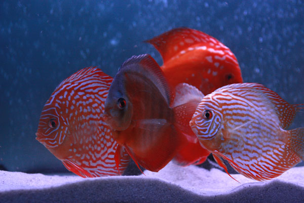 И как-то так опа - и плавают уже в этой баночке большие круглые блюдца - дискусы. А потом еще один товарищ - моторчик.