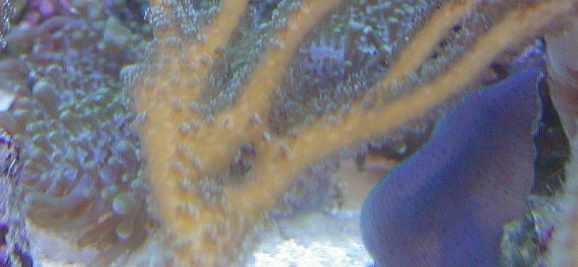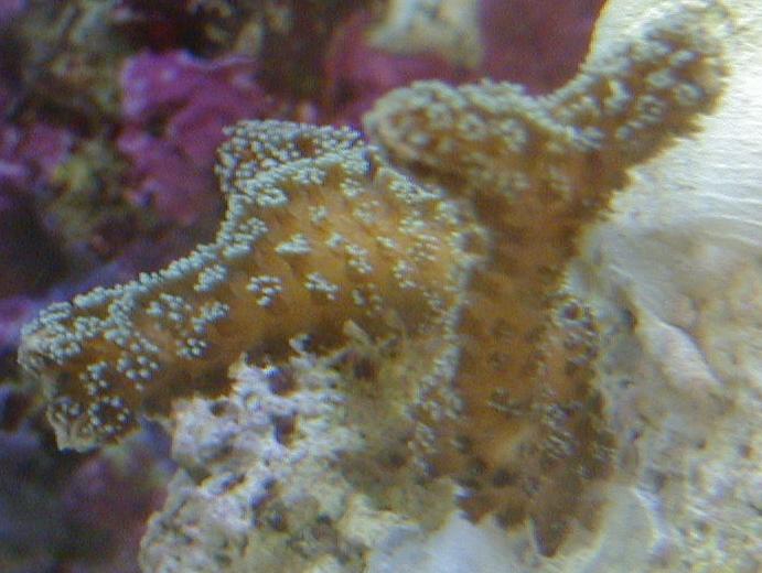 Самый молодой коралл в банке. Чуть больше двух месяцев. Растет хорошо. Прирос к камушку и тянется к свету. На родине растет на мелководье и печется солнцем. Поэтому напоминает половинку мяча. В аквариуме света ему мало, поэтому и растет вверх пальцами. Неприхотлив.