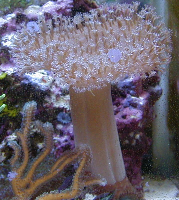 Неприхотливый мягкий коралл. В банке примерно 5 месяцев. 2 раза линял. Потихоньку растет. Приехал без камня, прирос бистро. Привязывал к камню ниткой.