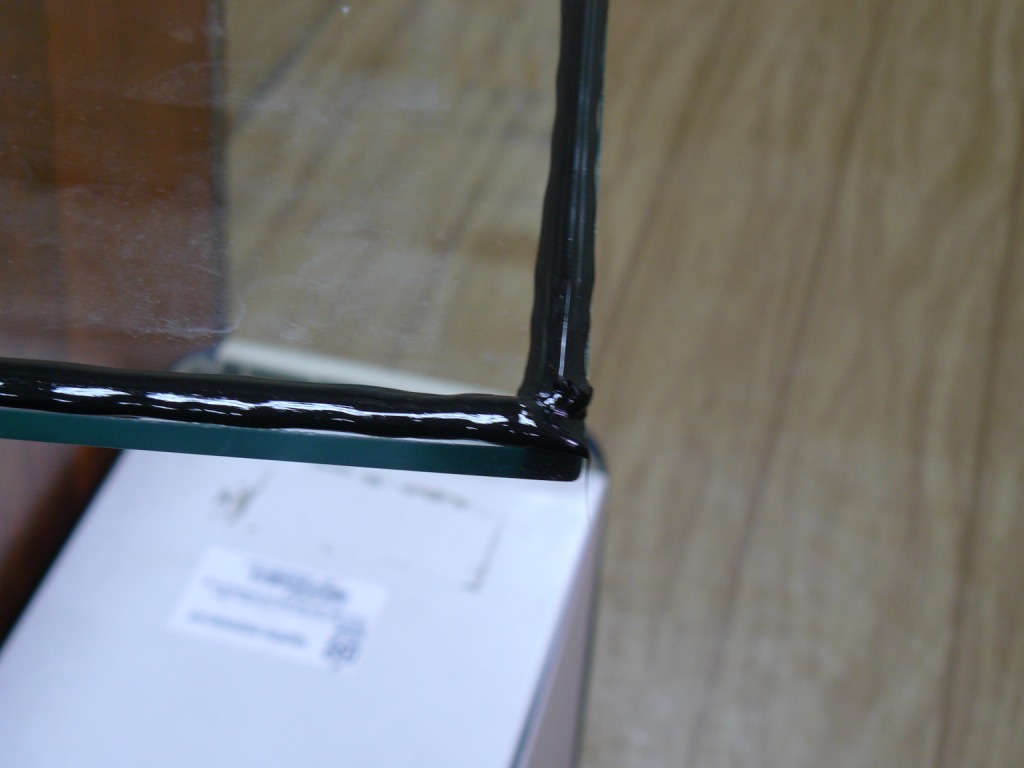 Согласитесь не очень аккуратно, хотя если набить руку и наносить герметик нужной толщины и ровным швом, то можно и не обрабатывать .Но пока умею только так. Сутки прошли, иду в ночь на работу за одно обработаю швы и кое что еще сделаю. Вооружившись лезвием от канцелярского ножа, приступаю к обрезке излишек герметика. Как бы объяснить? Стекла приклеены таким образом: лицевые наложены на боковые, это видно на фото выше, лезвие плотно прижимая к боковому стеклу, от дна до самого верха подрезаю герметик. Таким же образом подрезаю вдоль лицевого стекла, но тут момент один, главное не резануть между стеклами. Не с первого раза, но я понял, как нужно держать лезвие, чтоб не совершить ошибок))). Если кто и применит этот метод, то сообразит, как это делается. Смотрим фото: