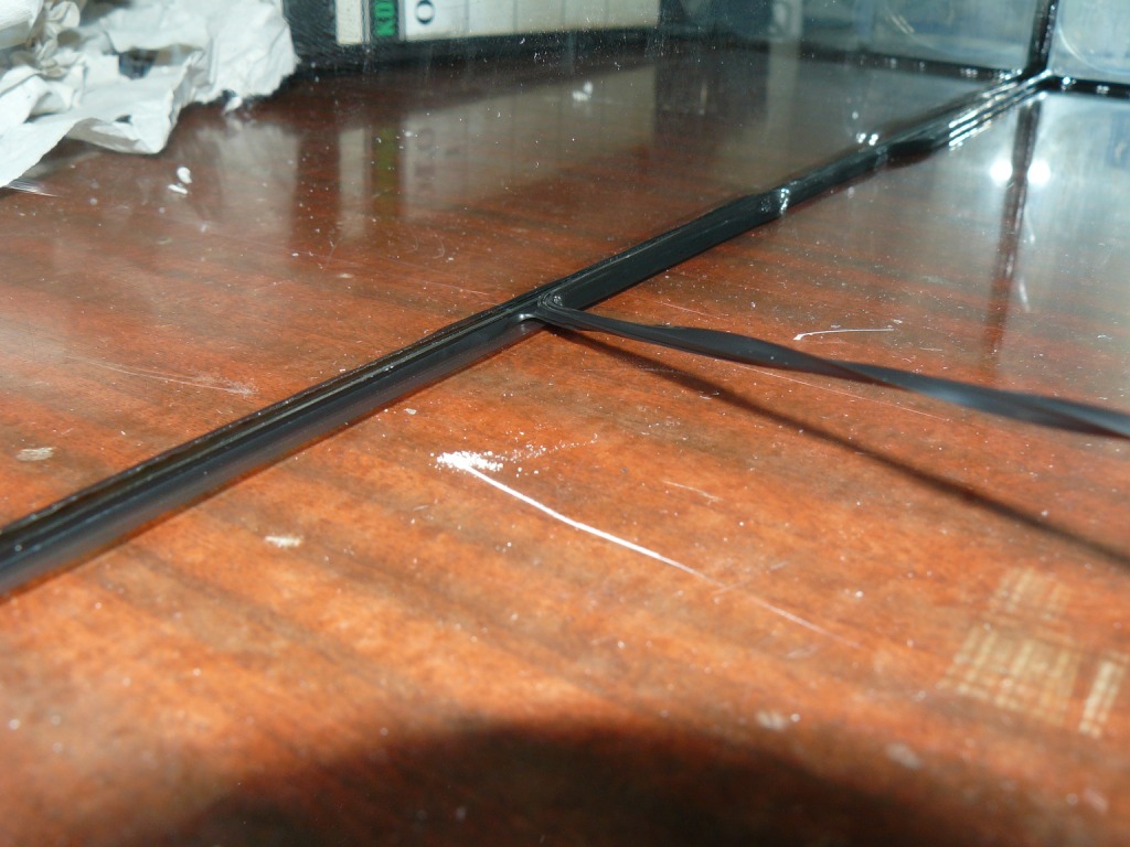 И так со всеми углами. Дно я не обрезаю т.к. будет наклеена пленка и ничего видно не будет. После того как отрезал лишнее, обрабатываю все углы растворителем. Взяв новый «носик» от тубы герметика, нужно отрезать его кончик под углом в 45 градусов. Носик который я использовал для склейки аквы был отрезан с таким расчетом, чтоб колбаска имела толщину примерно в 6 мм.. Смотря какую толщину шва вы хотите увидеть так и отрезайте с таким расчетом. Я отрезаю самый кончик, чтоб получился шов примерно в 2-3 мм. Аквариум нужно положить на бок. Теперь самый «страшный» процесс, с помощью пистолета аккуратно с низу вверх выдавливаю герметик и тем самым формирую шов. К сожалению сфоткать этот процесс не получилось т.к. клеил один, а наносить герметикь и фоткать не получиться.