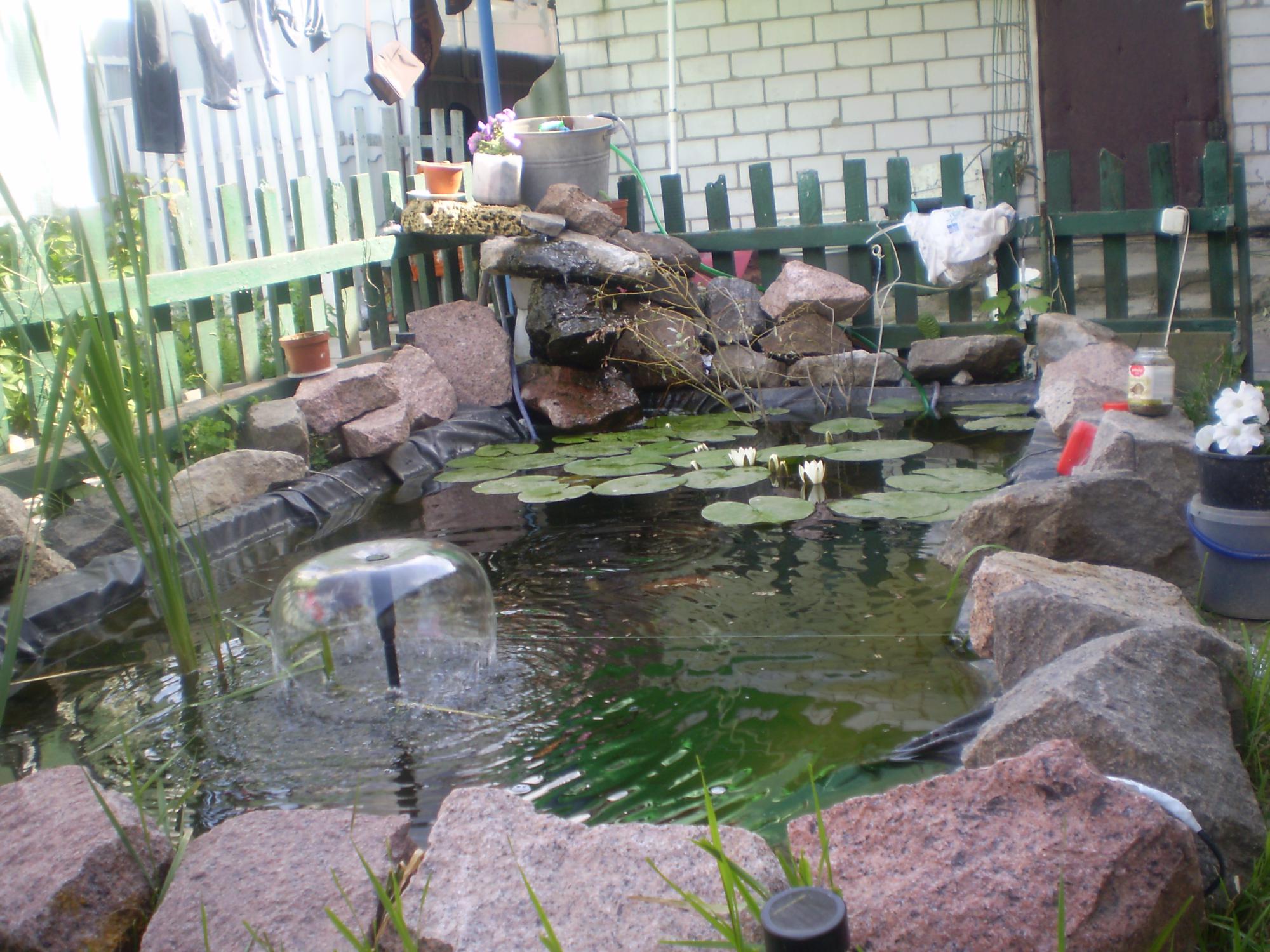 вырыл в прошлом году водойом-глубина 1.5..в одном месте ямка50см.на 50см...2м глубиной .длина пруда 3.5м ширина 2м.короче воды чуть больше 10тонн..застелил двойным слоем пленки обычной.и вперед..посадил белые лилии.карп обычный один 4.5кг.и 3 помельче по1.5кг.карасей набросал.лилии цвели все лето..поставил две помпы на 3000л.час подают воду в канистру с мочалками на верх.и по камнях вода стекает по принципу водопада..поставил циркуляционную помпу 2000л.час..короче порядок....перезимовали нормально..накрывал пленкой и оставил на всю зиму компресор...весной начала немного зеленеть вода...поставил ветку ивы....порядок..карпы подпрыгивали и самый крупный выпрыгнул и засох...дома не было никого...месяц назад пленка начала протекать...прикупил итальянскую пвх...начал все менять...откудато 2 окуня взялось...нифига не пойму..откуда они могли взятся...очень много было пиявок...короче растительность всю выбросил...лилии хорошо промыл и пересмотрел на наличие пиявок...и оставил камыш...он у меня в горшке был..так я его сутки держал без воды...вопрос к знатокам---как побороть эпидемию пиявок?b следующий вопрос--кои у меня в аквасе переросли..как ни жаль но пришлось их выпускать...кои -бабочки...каковы шансы перезимовать в таком пруду..что им может угрожать...есть в пруду одна золотушка..тщательно осмотрел---здорова...также пересмотрел всех остальных обитателей....все были здоровы...3 карпа по 2кг.5 карасей....слышал такое что малазийская рыба у нас не зимует...мои эту зиму провели в аквариуме...но они уже переросли объём акваса...их гдето грам по 300....зимовку такуюже планирую--оставить включенным аэратор..да и еще--поскольку пленка сильно дорогая то углубление не получилось зделать...но все дно выровнял по 1.7м.глубиной..ну и конечно сверху накрою пленкой.....фотки есть на моем профиле...чуть позже выложу после перекладки новой пленки....да ..и успеют ли принятся лилии..вроде передают еще как минимум месяц тепла