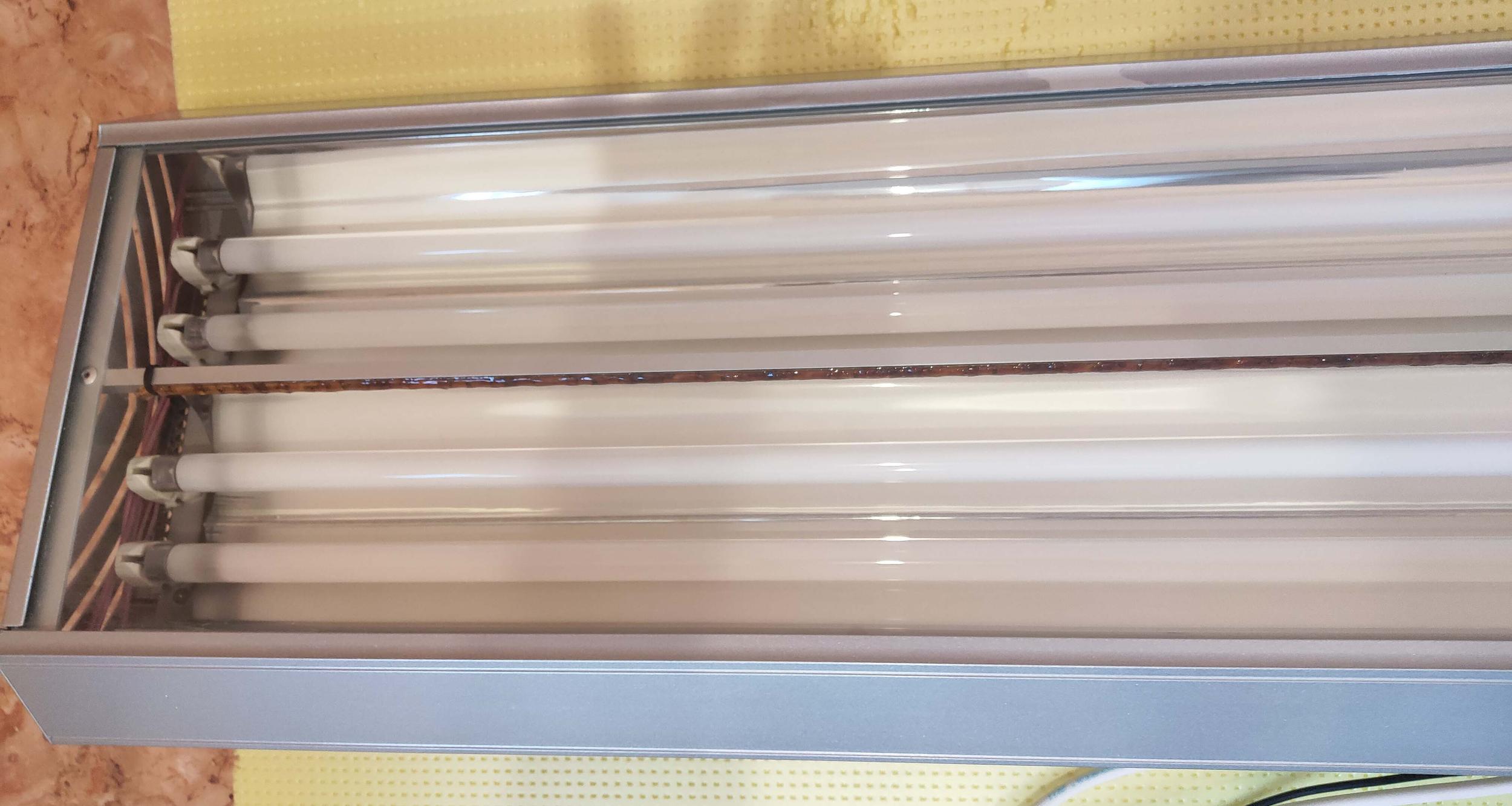 Четыре лампы Т5 по 54Вт с отражателями (2 эпра). Лампы защищены стеклом. Освещение разделено на 2 + 2 лампы, что позволяет с утра включать 50% освещения, днем 100% и вечером 50%.