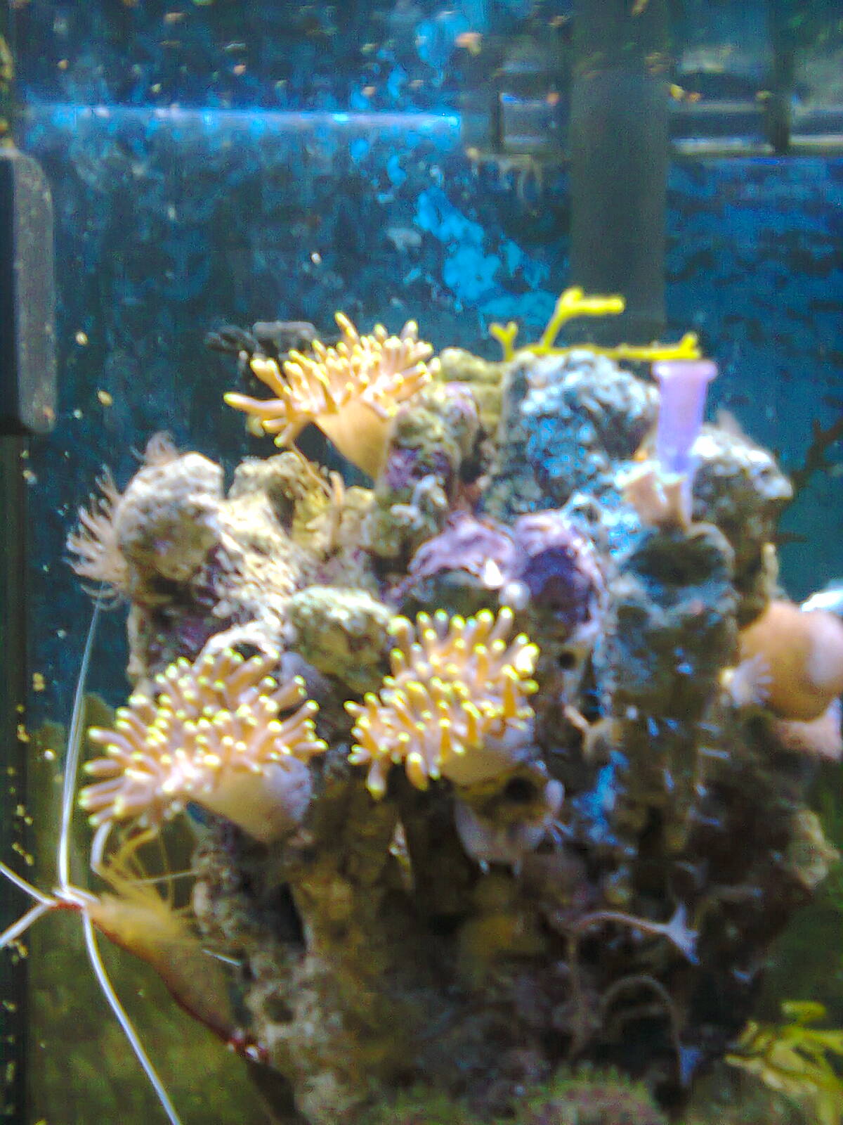 вот такой живет у меня зверь...почти год ...не бегает не розмножается---изначально было мнение что это маяна..сантиметров 10 в высоту и сантиметров 5 толщиной..кушает все вподряд...клоуны иногда в ней прячутся..но не постоянно----кто может подсказать что это за актиния ?