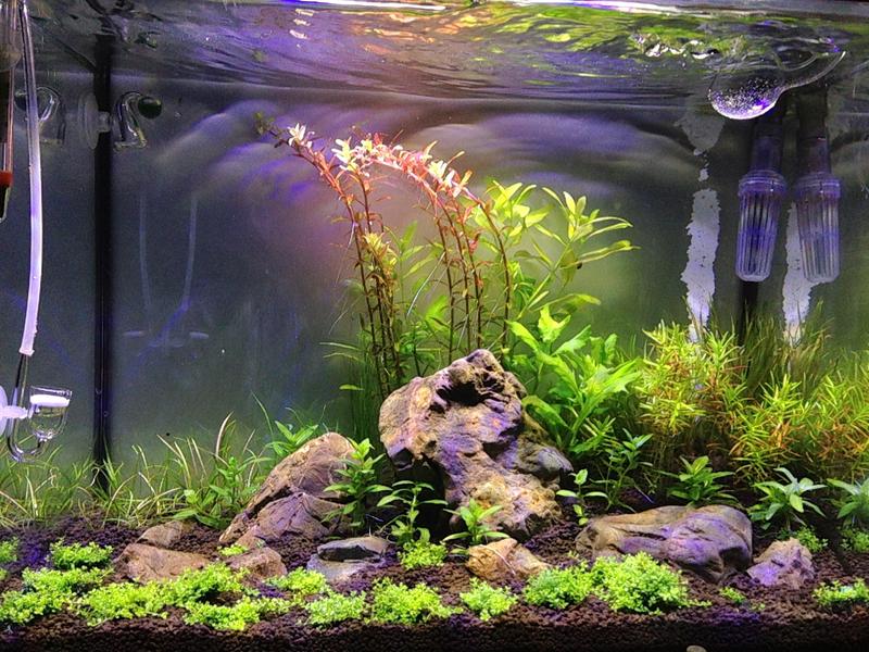Каждый день подмениваю 50% воды на осмос+реминирализатор. Добавляю калий. Свет 7 ч, СО2 7ч 1п/с. после выключения устанавливаю сопло вентури на выходной патрубок фильра для аэрации. Растения уже повыпускали новые корешки, куба тронулась в рост, хотя немного смотрит вверх, вроде света достаточно, если что можно будет добавить.