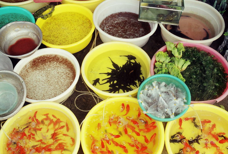 Две хихикающие (от того, что я их фотографирую) барышни торгуют и живым кормом в т.ч. Посмотрим, что у них сегодня в асортименте.