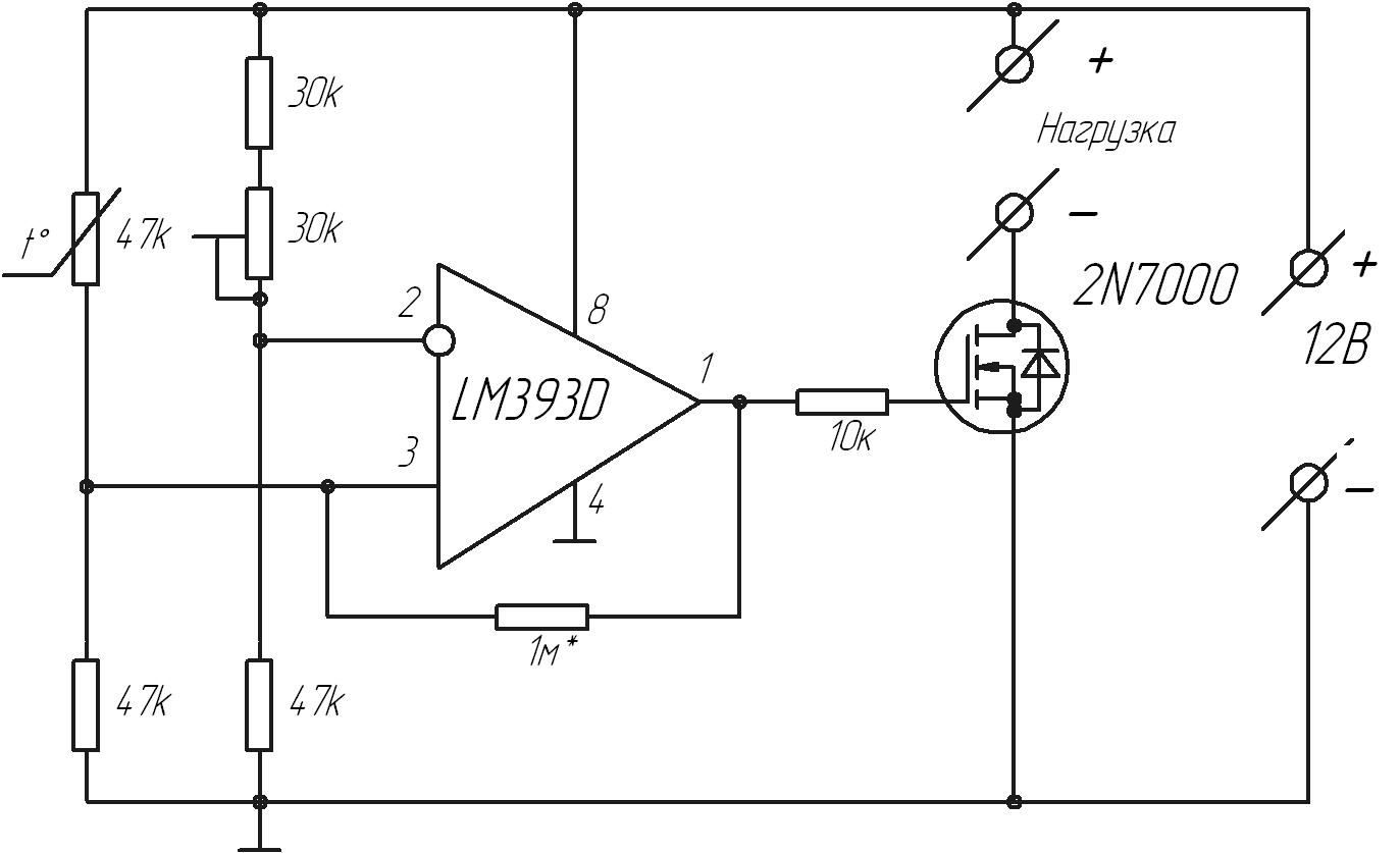 Итак сама схема является сочетанием аналогового компаратора и транзисторного ключа (хотел с начала делать ключ на маломощном тиристоре, но отговорили). Термодатчик являет собой терморезистор, запаянный в водонепроницаемый кожух. Номиналы резисторов на цепь управляющую и цепь сравнения подбираются из выбранной микрухи. При использовании компаратора номиналы сопротивления принимаем раз в 10 меньше чем при использовании операционного усилителя. Но опять же нужно корректировать. Сопротивление ОС подбирается из условия стабильного переключения компаратора (без дребезга в приграничной области переключения). чем больше сопротивление, тем выше вероятность дребезга, но меньше "гистерезис". По опыту использования некоторых "микрух" я выбрал начальное значение 300К.