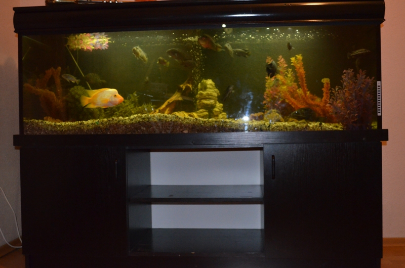 Продам акваріум зі всім обладнанням (фільтр, компресор, нагрівач, автокормушка, "пилесос" акваріумний), грунтом, водорослями, декором, тумбою та рибками (малавійські цихліди близько 20 шт. та соміки 3 шт.
