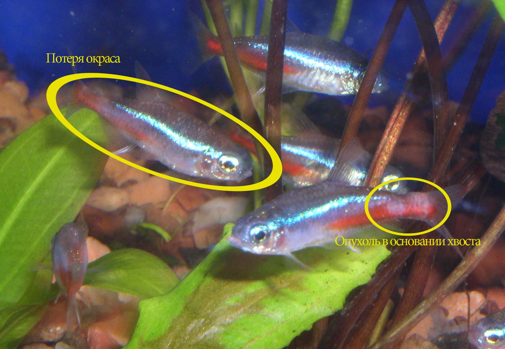 Заболело несколько неонов. Плавают как и раньше стайкой. Ухудшение аппетита не наблюдается. Симптомы болезни начинают проявляться с основания хвоста в виде опухоли. В сети поискал симптомы и болезнь, более менее под описание попадает Плистифороз, но я не специалист и в нюансах не разбираюсь и боюсь ошибиться с диагнозом. Подскажите что это может быть и как с ним бороться.