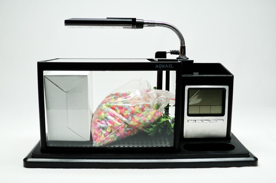 Это полностью укомплектованный аквариум, который можно без труда разместить на рабочем столе.