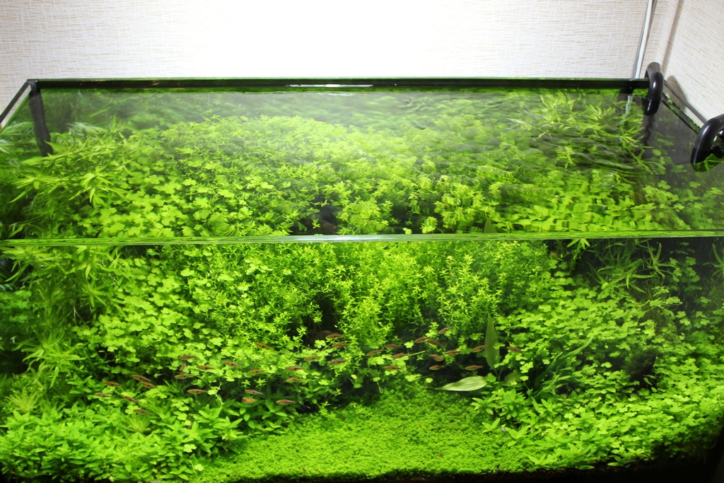 Световой день уже 9.5 часа. Травка растёт достаточно быстро. Приходится стричь раз в две недели. Учусь правильно формировать шапку из хемиантуса. Нитрат/фосфат замеряю каждую неделю. Водорослей нет чему очень рад. Учусь фотографировать аквариум очень не простое дело, пока не выходит, как следует, но знаю, что научусь рано или поздно))). выставлю еще немного фотографий на ваш суд: