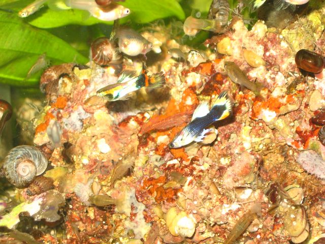 Гуппи не обращают внимания, сначала заинтересовались, теперь просто мимо плавают. Креветки активно копошатся.