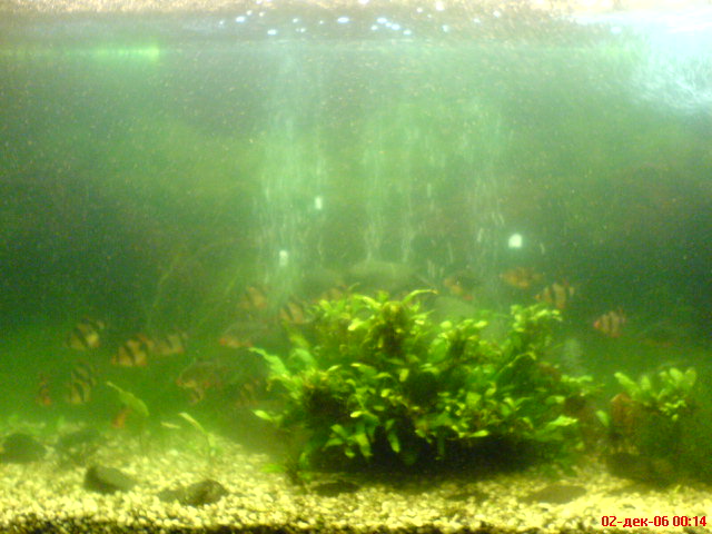 Если Алгизит уже набросал, то он поможет, только выбрал ты из аналогичных ,,Тетровских" препаратов самый медленно действующий. Надо было брать ,,Алгумин". А вообще я пользуюсь в таких случаях прудовым ,,АлгоРемом" - эфект обалденный! Два дня точной дозировки со шприца, с несколько раз в день промывкой внутреннего фильтра - и вода как стекло. А причина позеленения - свежая вода, избыток света, недостаточное количество растений. На фотке плохо видно - они хоть живые, или искусственные?