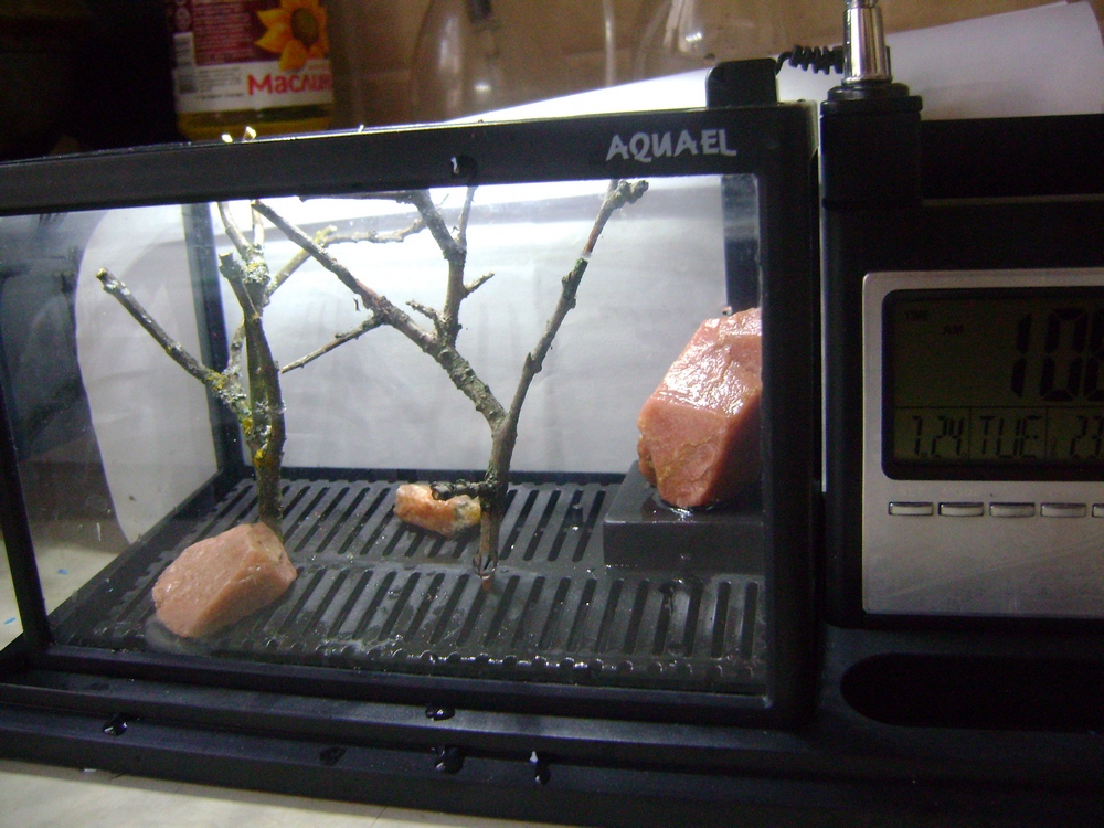 1. Свет слабоват. Вернее, он достаточный для спокойного существования на рабочем столе вместо пепельницы "медленного" аквариума (по люксометру на дне, прямо под светильником имеем 400 Лк), но этого совершенно недостаточно для "разгона" его (что диктуется жесткими сроками конкурса)- для этого (во всяком случае по моему опыту) нужно хотя бы 1000 Лк. Отсюда вывод для себя- буду ставить дополнительный свет на начальном этапе. Чего и коллегам желаю